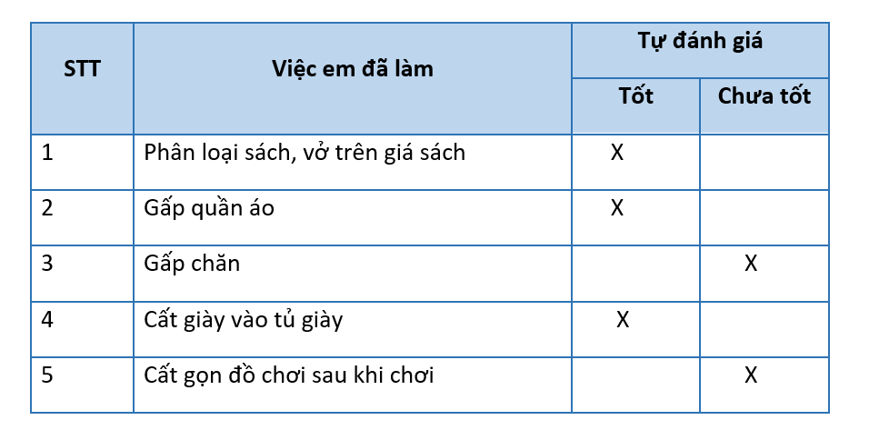 Viết 5 việc em đã làm để đồ dùng cá nhân gọn gàng, ngăn nắp và tự đánh giá kết quả thực hiện