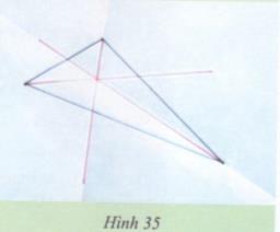Vẽ một tam giác trên giấy. Dùng phương pháp gấp giấy để xác định ba đường phân giác của tam giác (hình 35). Sau khi gấp xong, em hãy mở tam giác ra quan sát và nhận xét: Ba nếp gấp có cùng đi qua một điểm không ?