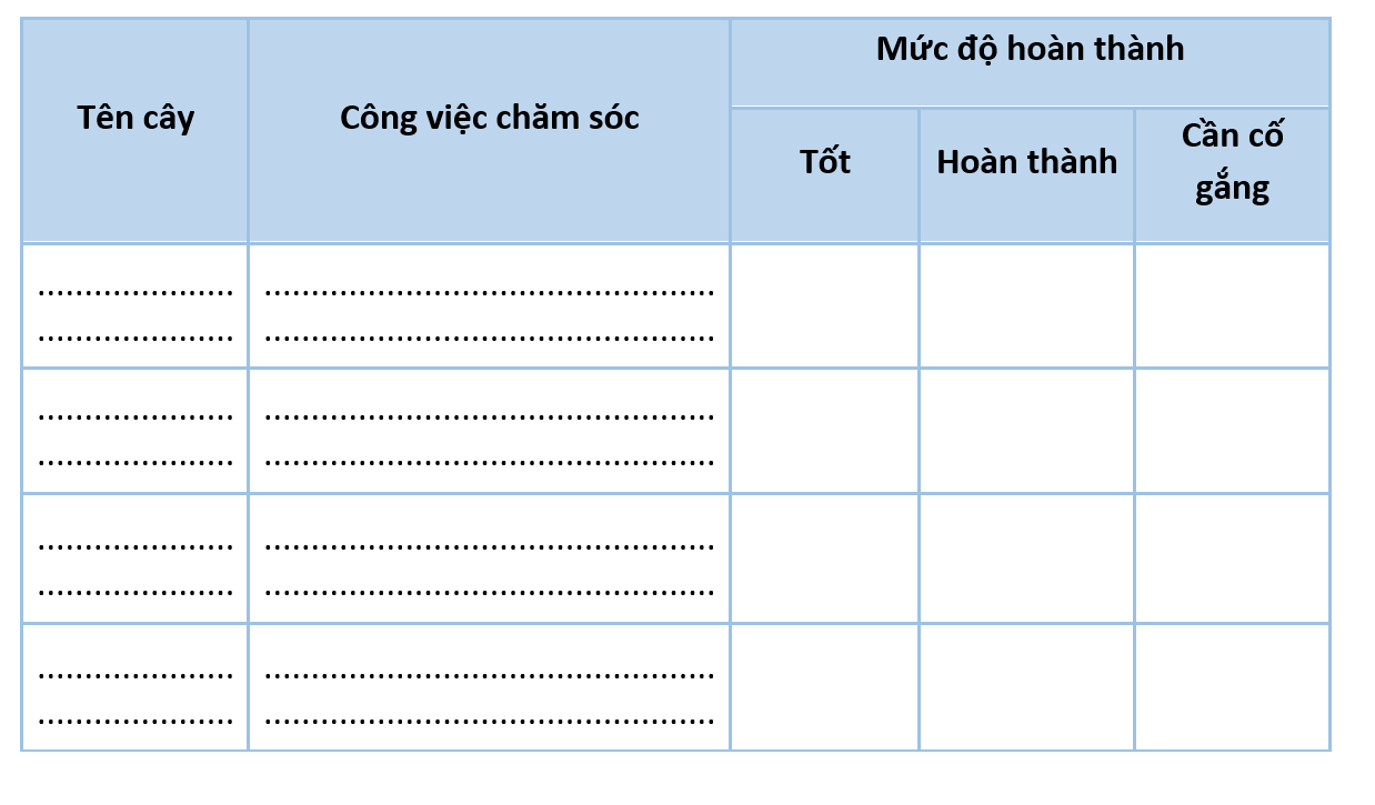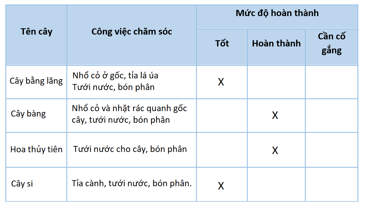 Em hãy ghi lại kết quả thực hiện kế hoạch chăm sóc cây xanh vào bảng sau: