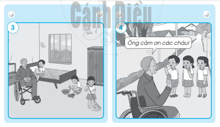 4. Sau khi giúp ông Ba, trời cũng đã tối, ba bạn nhỏ tạm biệt ông rồi về nhà. Ông Ba rất vui vì mỗi ngày đều có ba bạn đến trò chuyện, giúp đỡ ông. Ông ra tận cổng để tiễn các bạn về, không quên nói lời cảm ơn các bạn nhỏ.