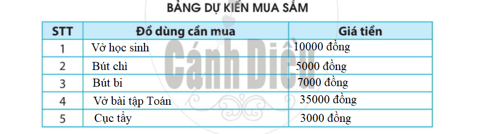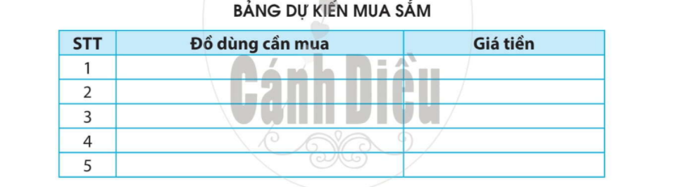Để chuẩn bị cho học kì 2, em cần mua thêm những đồ dùng học tập gì? Hãy hoàn thành bảng dự kiến mua sắm dưới đây: