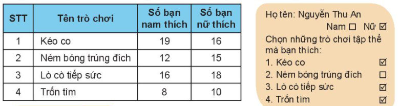 Trò chơi nào được nhiều bạn nam yêu thích nhất? Trò chơi nào được nhiều bạn nữ yêu thích nhất? Trò chơi nào được học sinh của lớp yêu thích nhất?