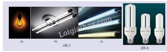 Hãy tính hiệu suất phát sáng của bóng đèn sợi đốt, đèn huỳnh quang, đèn LED (hình H8.5). Cho rằng điện năng tiêu thụ của đèn được chuyển thành nhiệt năng và quang năng. Tỉ lệ nhiệt năng tỏa ra so với quang năng đối với đèn sợi đốt là khoảng 15 lần, đối với đèn huỳnh quang là khoảng 4 lần và đối với đèn LED là khoảng 2 lần.