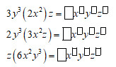 \(\eqalign{  & 3{y^3}\left( {2{x^2}} \right)z = 6{x^2}{y^3}{z^1}  \cr  & 2{y^3}\left( {3{x^2}z} \right) = 6{x^2}{y^3}{z^1}  \cr  & z\left( {6{x^2}{y^3}} \right) = 6{x^2}{y^3}{z^1} \cr} \)