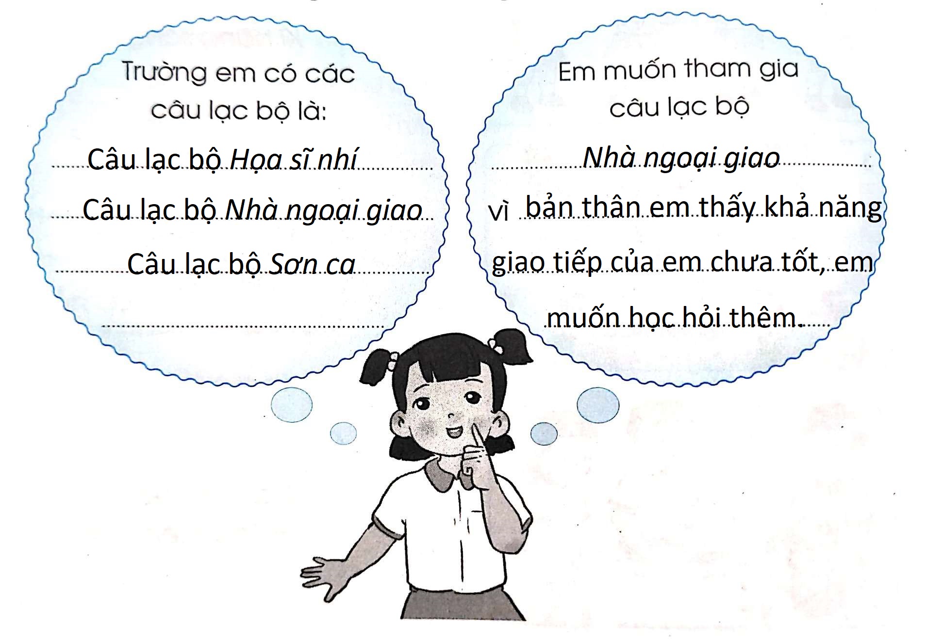 – Ở trường em có những câu lạc bộ nào? Em hãy kể tên các câu lạc bộ đó.