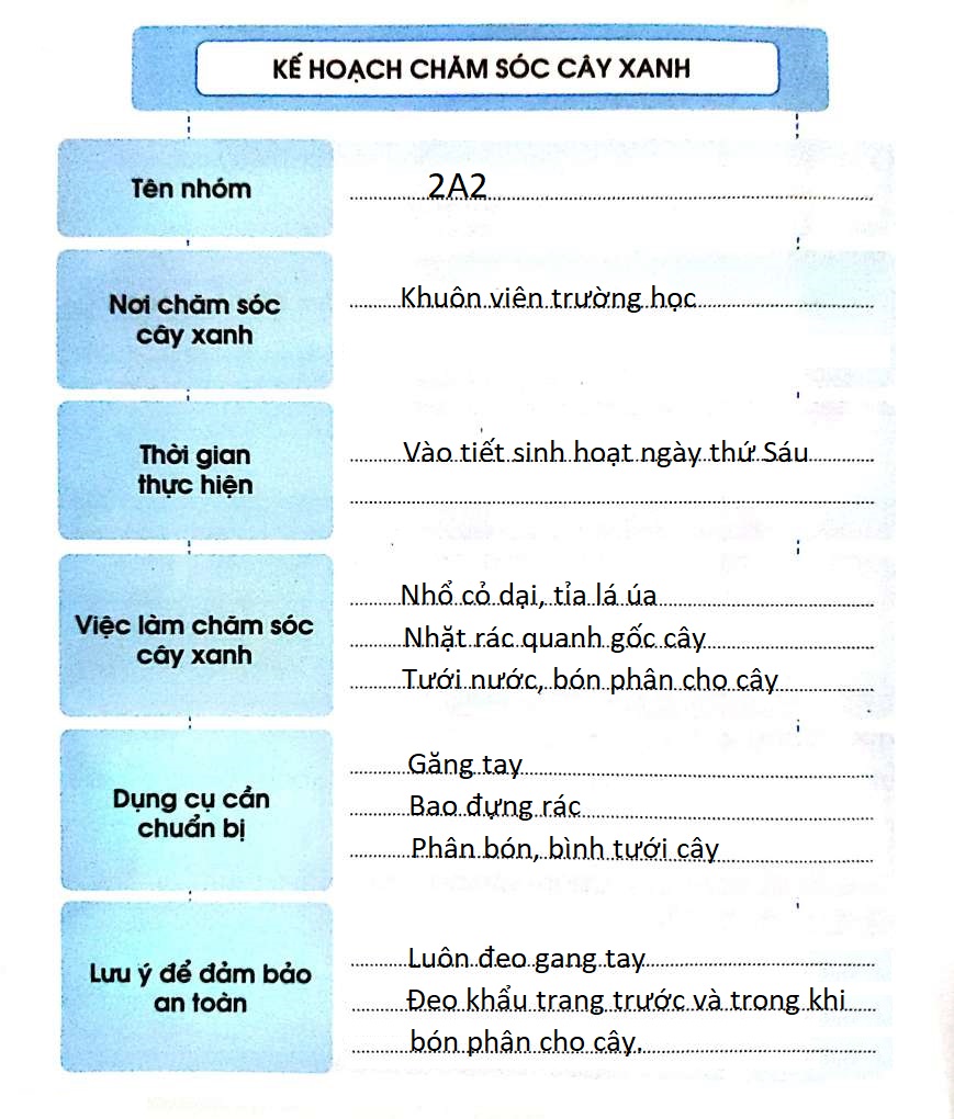 Em thảo luận cùng các bạn trong nhóm để xây dựng kế hoạch chăm sóc cây xanh rồi ghi lại vào phiếu dưới đây: