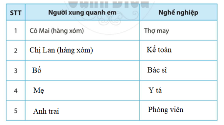 Chú ý: Em nên chọn những người mà gia đình gần gũi, hay trò chuyện để dễ dàng cho việc quan sát hay hỏi thăm nghề nghiệp của họ hơn.