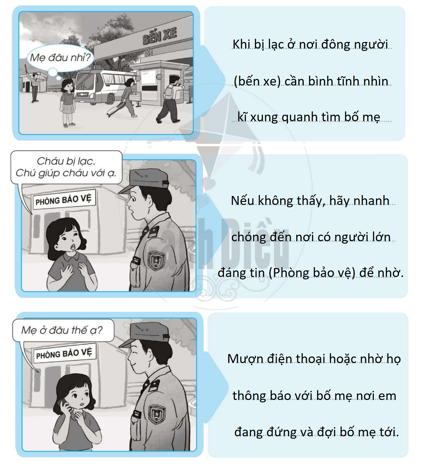 Em hãy nêu các bước xử lí khi bị lạc theo gợi ý trong các tranh bên dưới: