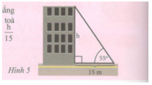 Một tòa nhà có chiều cao h (m). Khi tia nắng tạo với mặt đất một góc \({55^o}\) thì bóng của tòa nhà trên mặt đất có chiều dài 15 m. Tỉ số \(\dfrac{h}{{15}}\) bằng tỉ số lượng giác nào của góc \({55^o}\) ?