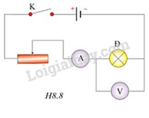 Mắc mạch điện như sơ đồ hình H8.8, Đ là bóng đèn nhỏ đã biết hiệu điện thế định mức và công suất định mức. Đóng công tắc K, điều chỉnh biến trở để số chỉ của vôn kế (cho biết hiệu điện thế hai đầu bóng đèn) bằng hiệu điện thế định mức của đèn. Quan sát và ghi nhận lại số chỉ của ampe kế để biết cường độ dòng điện qua đèn.