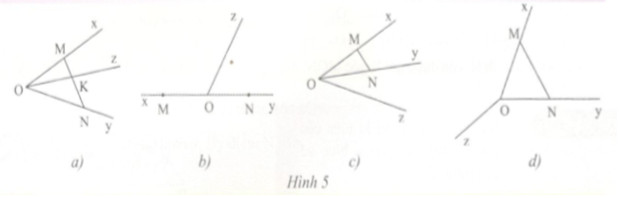 Trên hình 5a, b, c, d, lấy điểm M trên tia Ox, điểm N trên tia Oy (M và N đều không trùng với điểm O). Trong mỗi trường hợp hãy nêu giao điểm của đoạn thẳng MN với tia Oz.