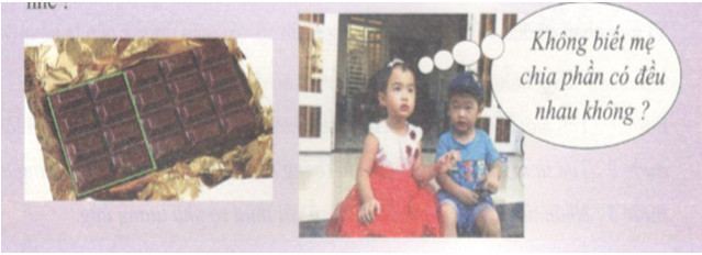 Mẹ chia một thanh Chocolate thành hai phần cho hai bé Mèo và Long như trong hình (bé Mèo lấy phần được đánh dấu, bé Long lấy phần còn lại). Bé Mèo thắc mắc : “Không biết mẹ chia phần có đều nhau không ?”. Em hãy trả lời bé Mèo nhé !
