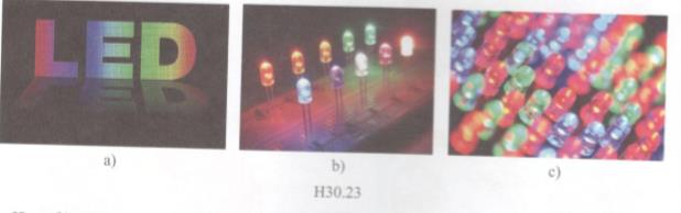 Ngày nay có rất nhiều loại đèn LED với các màu sắc phong phú, đa dạng (hình H30.23). Có đèn mà ánh sáng phát ra chỉ có một loại màu, như LED đỏ, LED cam, LED vàng, LED lục, LED lam, LED tím. Có LED cùng lúc phát ra ánh sáng đỏ và lam nên ta thấy ánh sáng đèn phát ra có màu đỏ tía; LED phát ra ánh sáng vàng và làm nên ta thấy đèn phát ra ánh sáng hồng; LED phát ra ánh sáng đỏ, lục và lam nên ta thấy đen phát ra ánh sáng trắng. Có LED có cùng lúc phát phát ra đủ các ánh sáng mà mạnh nhất là ánh sáng vàng và làm nên ta cũng thấy đén phát ánh sáng trắng.