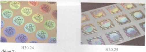 Trên nhiều thiết, máy móc, ta thường thấy dán các tem  xác định chất lượng sản phẩm đã được kiểm tra hoặc để xác định sản phẩm thật, không phải là sản phẩm giả mạo (hình H30.24, H30.25). Tùy theo góc nhìn các tem mà thấy chúng có màu sắc khác nhau. Em hãy giải thích sơ lược nguyên tắc hoạt động của các loại tem này.
