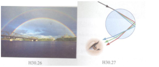 Thỉnh thoảng sau một cơn mưa vào buổi sáng hoặc buổi chiều, khi nhìn về hướng đối diện với Mặt Trời ta có thể thấy được cầu vồng (hình H30.26). Ánh sáng trắng của Mặt Trời khi khúc xạ và phản xạ qua các giọt nước li ti còn sót lại trên không trung sau cơn mưa đã bị phân tích thành các ánh sáng màu và tạo thành cầu vồng.