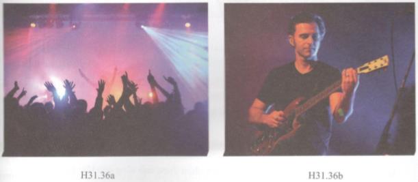 Các sân khấu ca nhạc vào buổi tối thường sử dụng rất nhiều đèn màu (hình H31.36a). Tùy thuộc vào màu sắc của ánh sáng đèn, ta có thể nhìn thấy màu sắc y phục của các diễn viên trên sân khấu thay đổi (hình H31.36b).