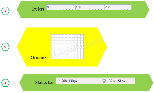 Khi nháy chọn vào mục Ruler/ Gridlines/ Status bar trên thẻ View, các thành phần nào sẽ xuất hiện trên trang vẽ ?