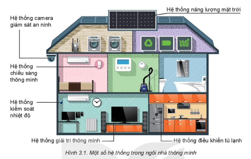 Quan sát Hình 3.1. và cho biết: biện pháp an ninh và tiết kiệm năng lượng trong ngôi nhà thông minh được thực hiện như thế nào?