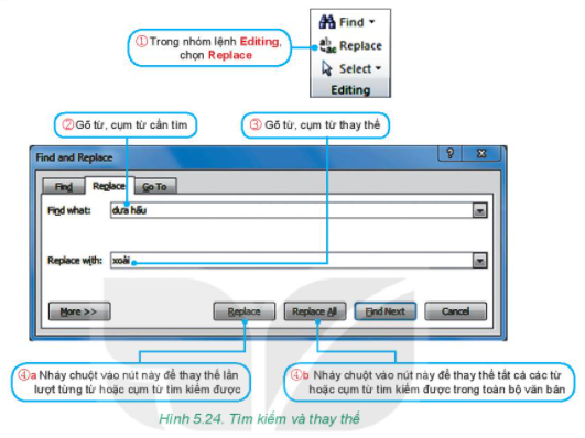 Thứ tự các thao tác thay thế một từ hoặc cụm từ trong phần mềm soạn thảo văn bản: