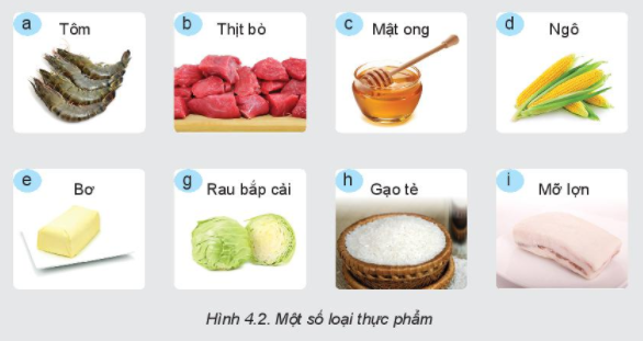 Sắp xếp các thực phẩm trong hình 4.2 vào các nhóm sau: Nhóm thực phẩm giàu chất tinh bộ, chất đường và chất xơ; nhóm thực phẩm giàu chất đạm; nhóm thực phẩm giàu chất béo.