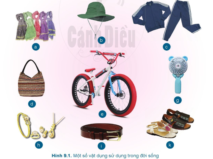 Trong hình 9.1 vật dụng không phải trang phục là: e, g. Xe đạp, quạt điện là đồ vật chứ không phải trang phục.