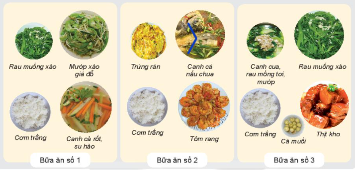 Trong ba bữa ăn sau, bữa ăn nào đảm bảo tiêu chí của bữa ăn hợp lí nhất? Vì sao?