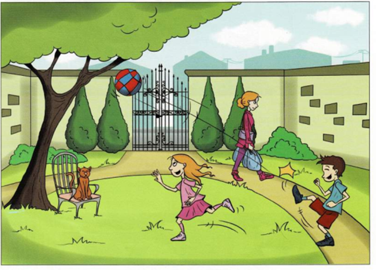 Woman: OK. There’s a boat between the tree and the wall. Colour that one, please. (Được. Có một chiếc thuyền ở giữa cái cây và bức tường. Em hãy tô nó nhé.)