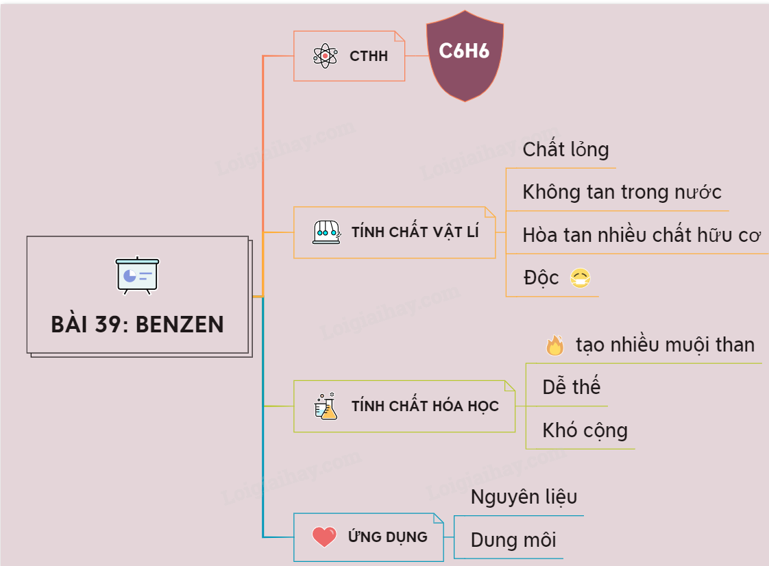 Benzen C6H6 là chất lỏng, không màu, không tan trong nước, nhẹ hơn nước, độc.