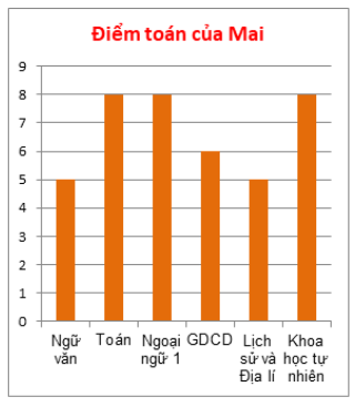 Biểu đồ trên cho thấy: Điểm ngữ văn của Tiến cao hơn Mai, điểm Toán của hai bạn bằng nhau, điểm Ngoại ngữ 1 của Mai cao hơn tiến