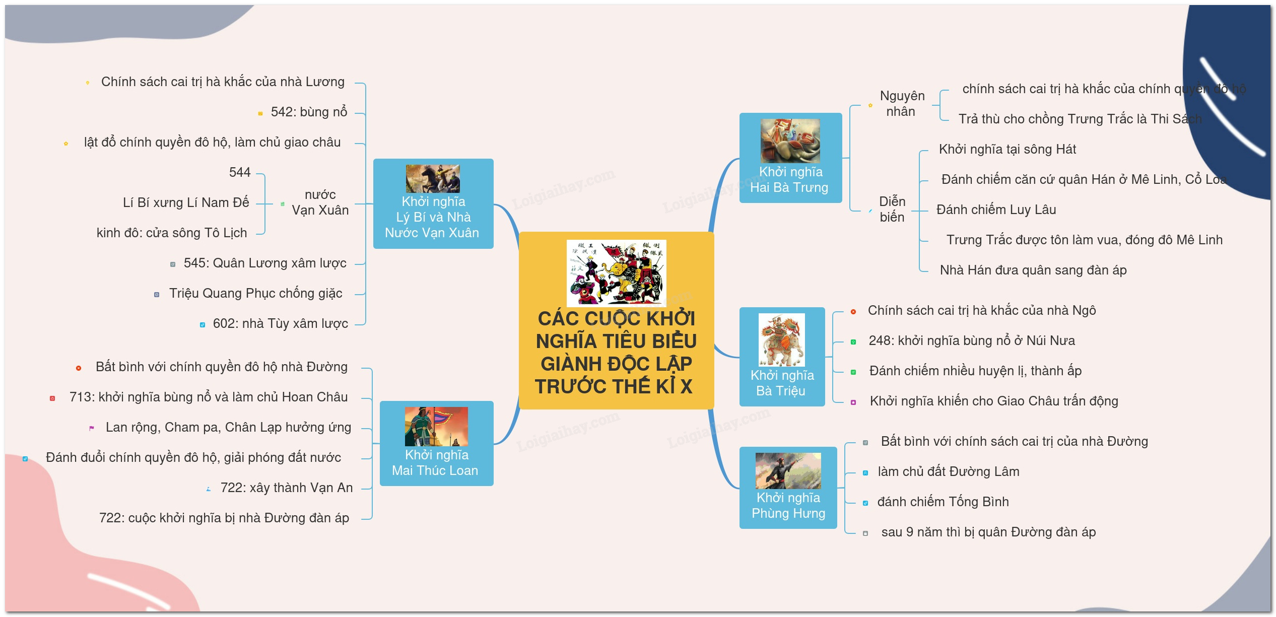 Sơ đồ tư duy các cuộc khởi nghĩa tiêu biểu giành độc lập trước thế kỉ X