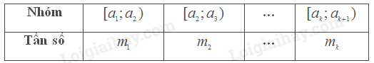 Trong đó, \(n = {m_1} + … + {m_k}\) là cỡ mẫu và \({x_i} = \frac{{{a_i} + {a_{i + 1}}}}{2}\)(với \(i = 1,2,…,k\)) là giá trị đại diện của nhóm \({\rm{[}}{a_i};{a_{i + 1}})\).