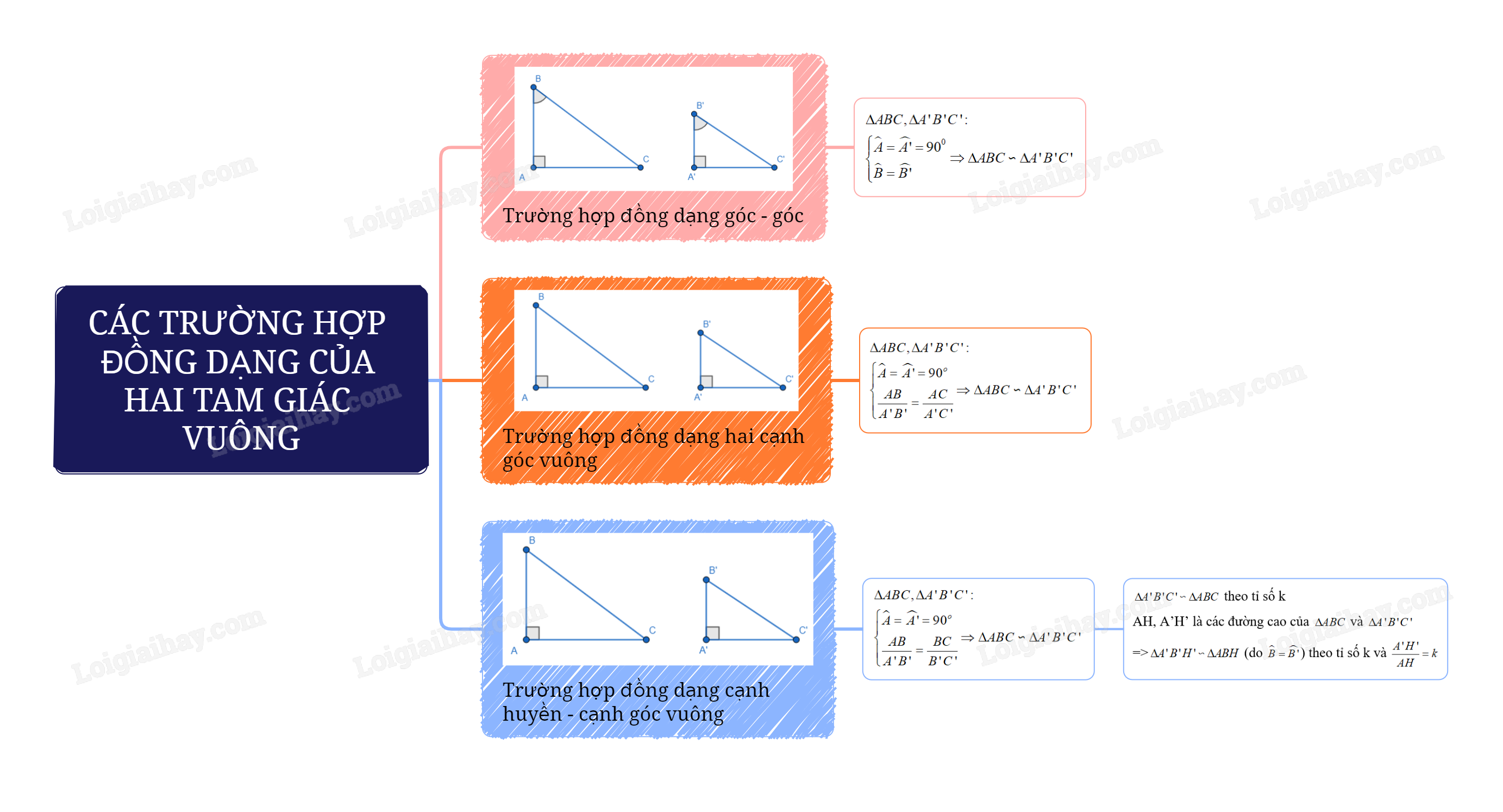 Nếu hai cạnh góc vuông của tam giác vuông này tỉ lệ với hai cạnh góc vuông của tam giác vuông kia thì hai tam giác vuông đó đồng dạng với nhau.