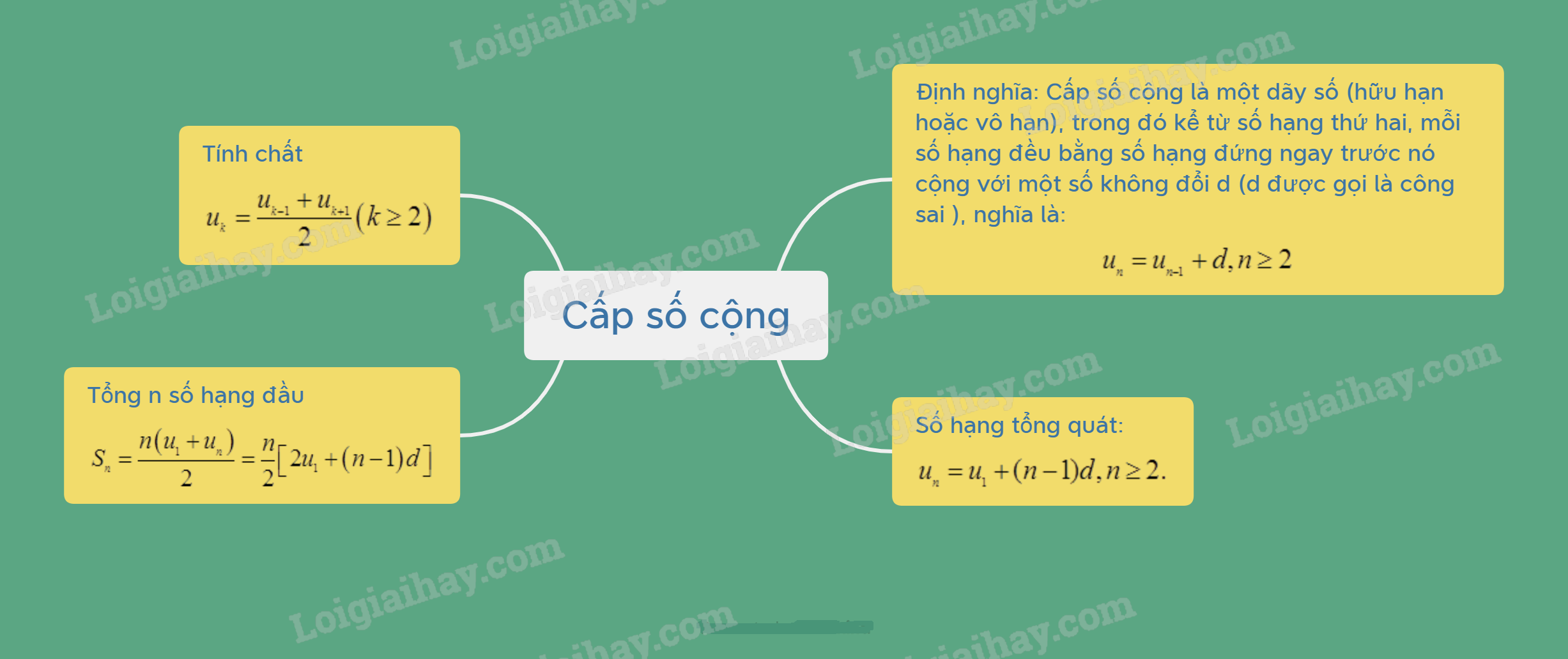 * Nhận xét: Nếu \(\left( {{u_n}} \right)\) là cấp số cộng thì kể từ số hạng thứ 2, mỗi số hạng (trừ số hạng cuối đối với cấp số cộng hữu hạn) đều là trung bình cộng của 2 sô hạng đứng kề nó trong dãy, tức là: