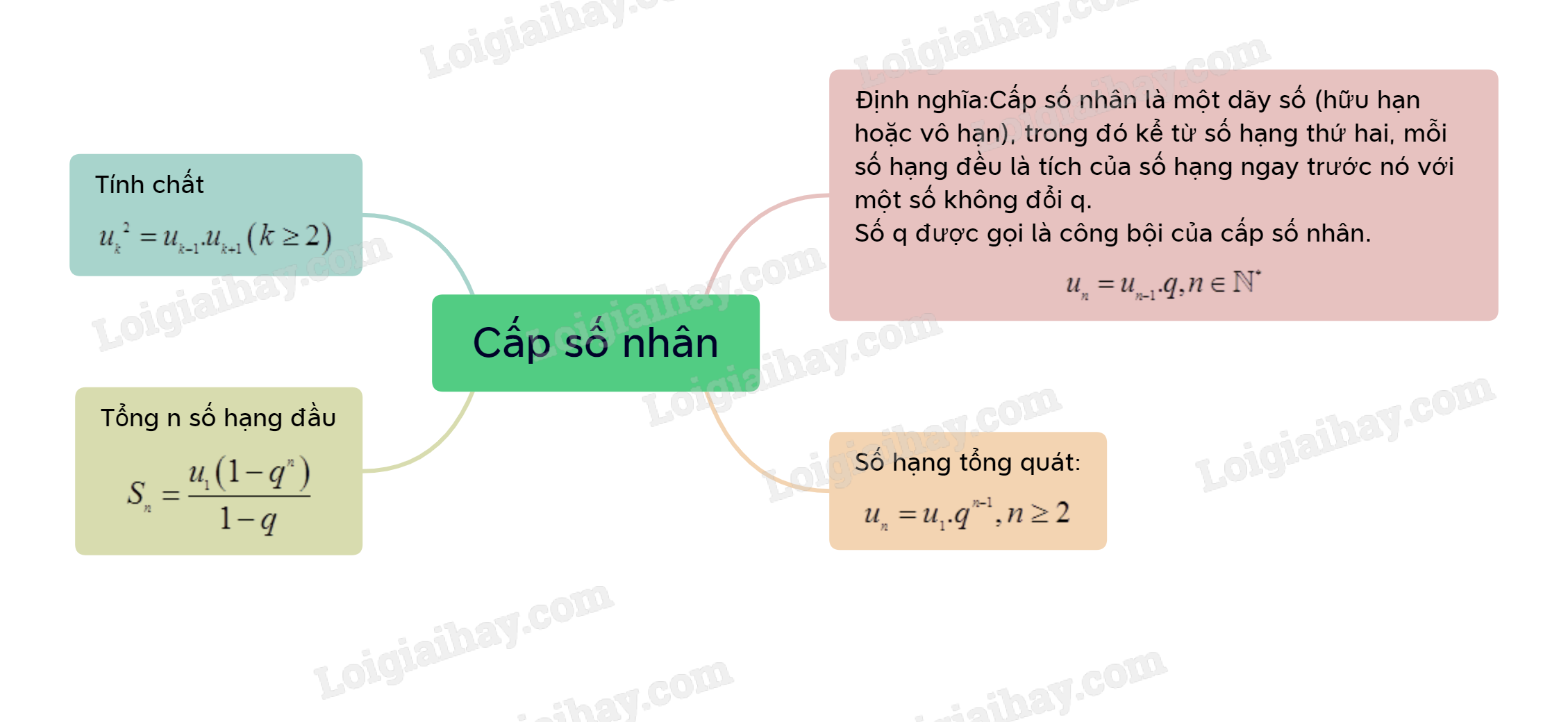 Nếu một cấp số nhân có số hạng đầu \({u_1}\) và công bội q thì số hạng tổng quát \({u_n}\)của nó được xác định bởi công thức