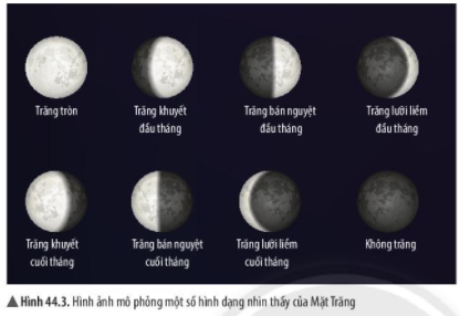 – Mỗi thời điểm, phần bề mặt Mặt Trăng hướng về Trái Đất được Mặt Trời chiếu sáng có diện tích khác nhau nên ta thấy hình dạng Mặt Trăng là khác nhau.