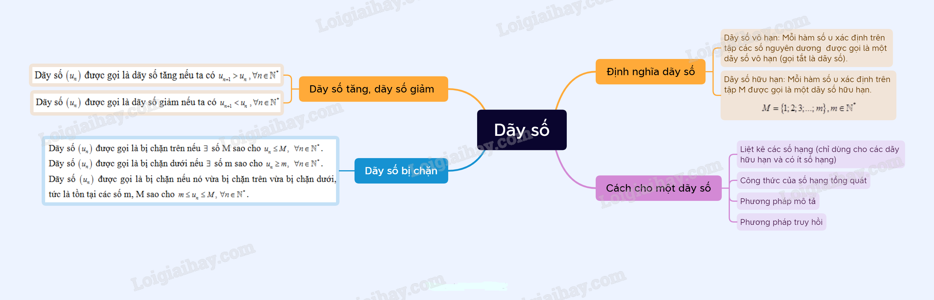 • Dãy số \(\left( {{u_n}} \right)\) được gọi là bị chặn nếu nó vừa bị chặn trên vừa bị chặn dưới, tức là tồn tại các số m, M sao cho \(m \le {u_n} \le M,\)\(\forall n \in {\mathbb{N}^*}\).