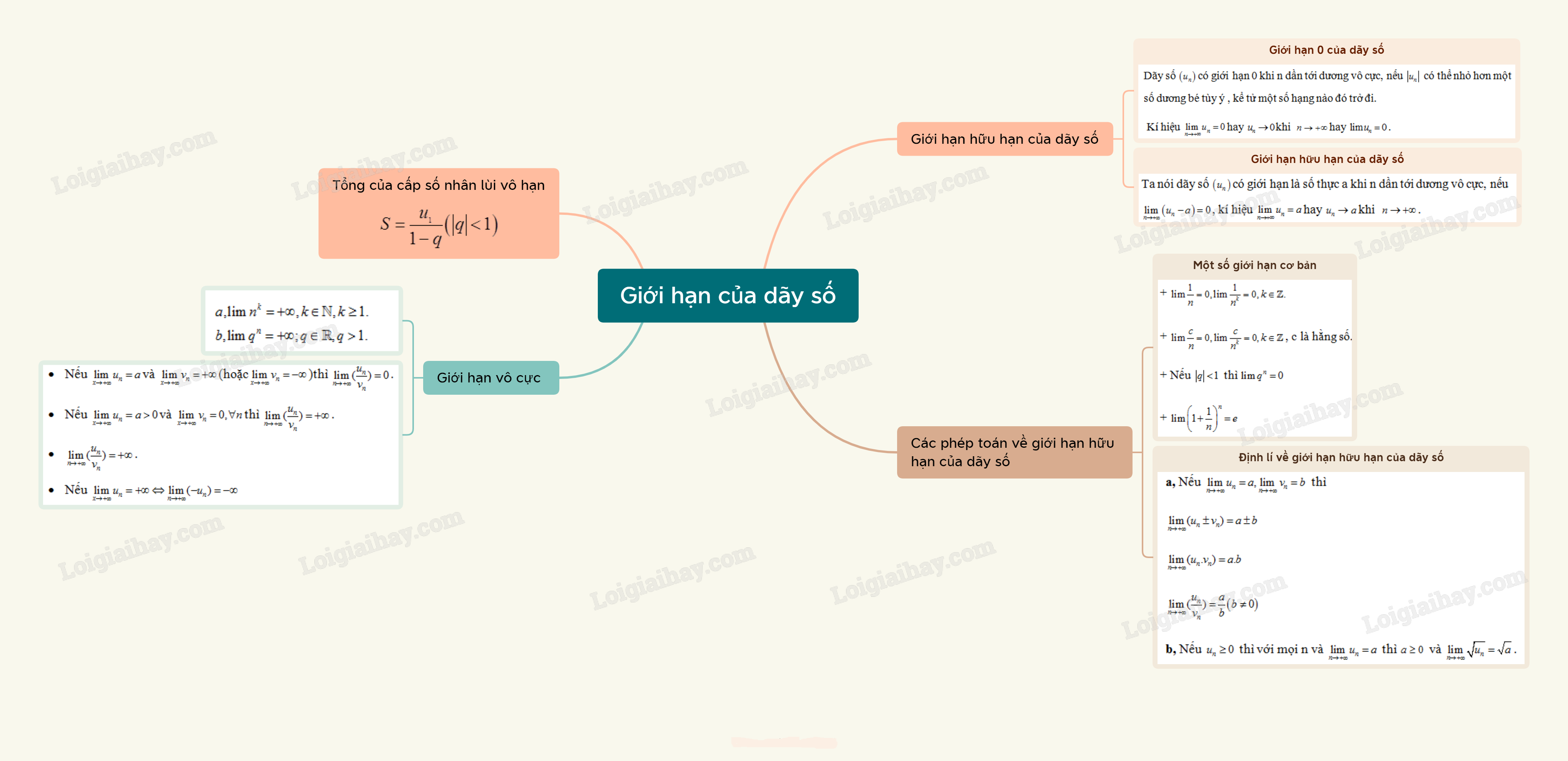 – Dãy số \(\left( {{u_n}} \right)\) được gọi là có giới hạn \( – \infty \)khi \(n \to  + \infty \) nếu \(\mathop {\lim }\limits_{x \to  + \infty } \left( { – {u_n}} \right) =  + \infty \), kí hiệu \(\mathop {\lim }\limits_{x \to  + \infty } {u_n} =  – \infty \) hay \({u_n} \to  – \infty \) khi \(n \to  + \infty \).