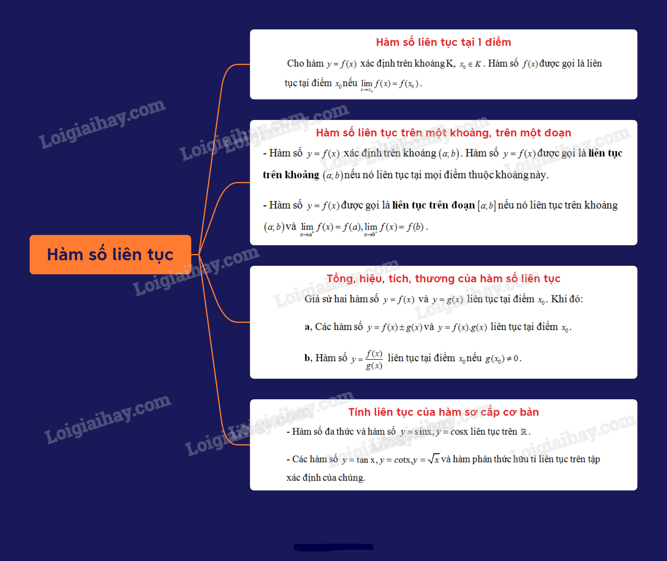 – Hàm số \(y = f(x)\) được gọi là liên tục trên khoảng \(\left( {a;b} \right)\) nếu nó liên tục tại mọi điểm thuộc khoảng này.