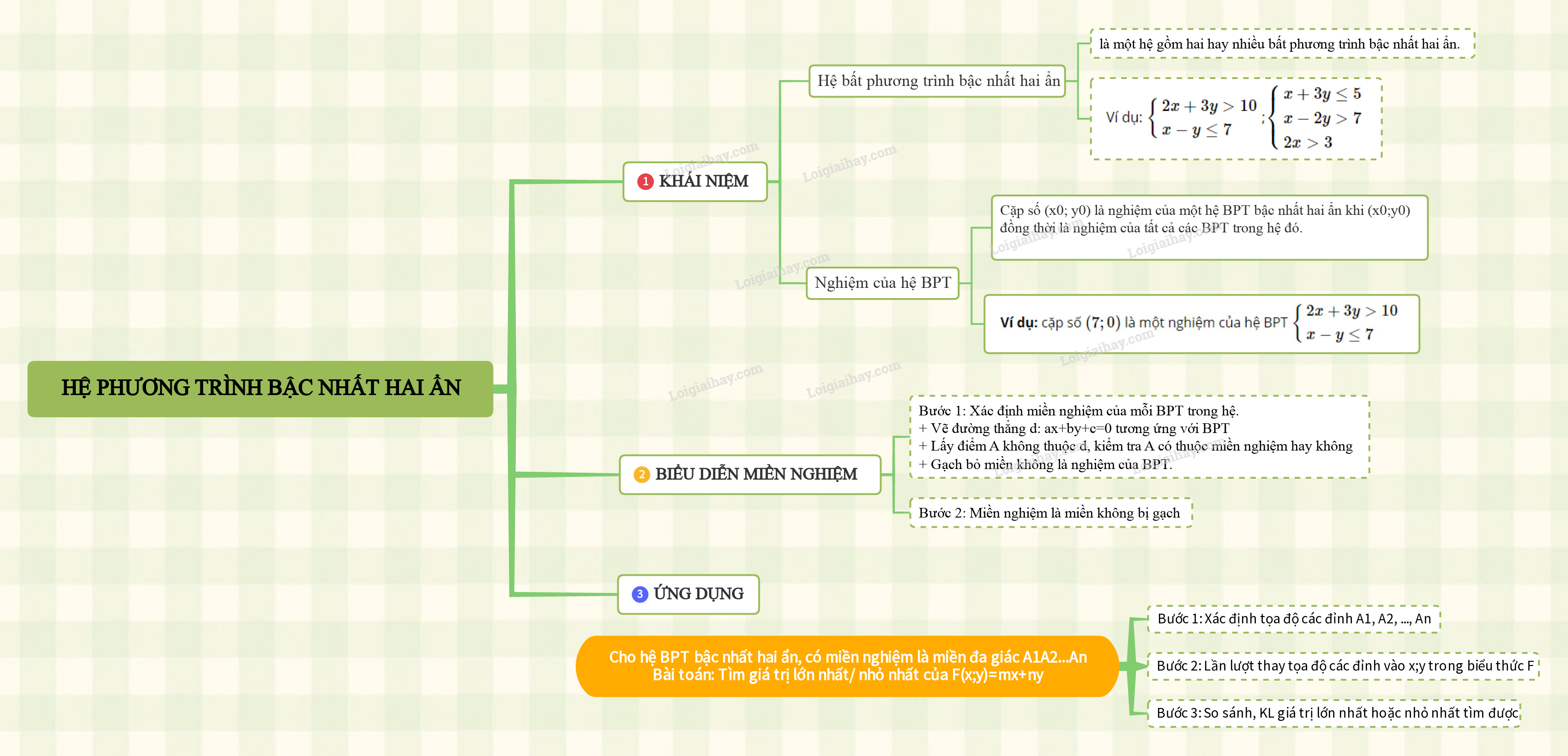 1. Khái niệm hệ bất phương trình bậc nhất hai ẩn 2. Biểu diễn miền nghiệm của hệ bất phương trình bậc nhất hai ẩn trên mặt phẳng tọa độ 3. Tìm giá trị lớn nhất hoặc giá trị nhỏ nhất của biểu thức F = ax + by trên một miền đa giác