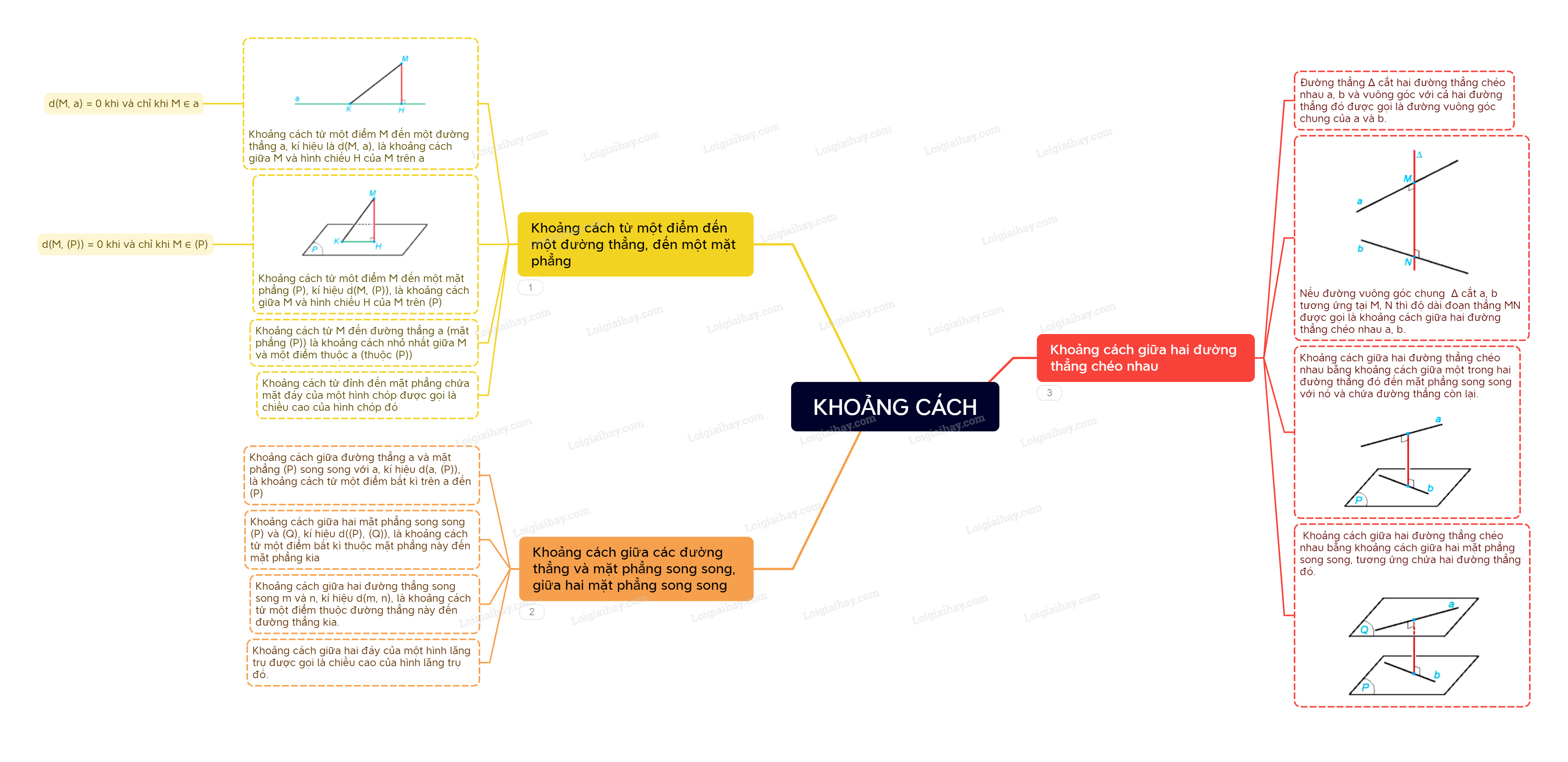 – Khoảng cách giữa hai đường thẳng chéo nhau bằng khoảng cách giữa một trong hai đường thẳng đó đến mặt phẳng song song với nó và chứa đường thẳng còn lại.