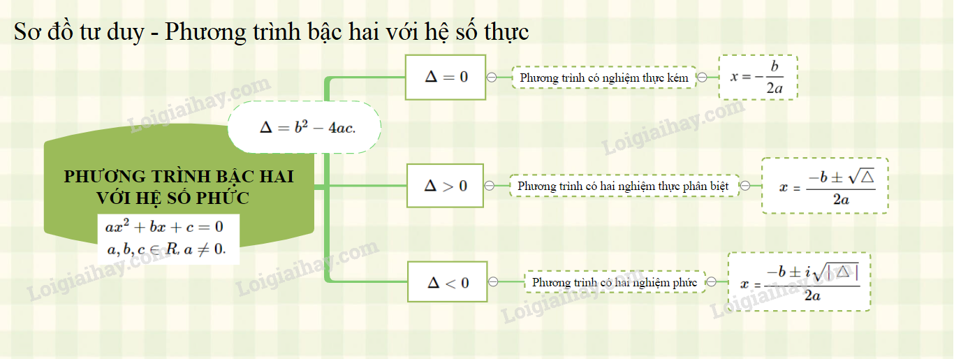 – Nếu \(∆ < 0\) thì phương trình có hai nghiệm phức \(x_{1,2}\) = \( \dfrac{-b \pm i\sqrt{|\bigtriangleup | }}{2a}\)