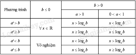 – Nếu b > 0 thì phương trình có nghiệm duy nhất \(x = {\log _a}b\).