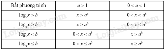 Bất phương trình lôgarit cơ bản có dạng \({\log _a}x > b\)(hoặc \({\log _a}x \ge b,{\log _a}x < b,{\log _a}x \le b\)) với \(a > 0,a \ne 1\).