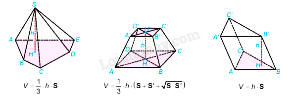 – Thể tích của khối lăng trụ có diện tích đáy S và chiều cao h là \(V = h.S\).