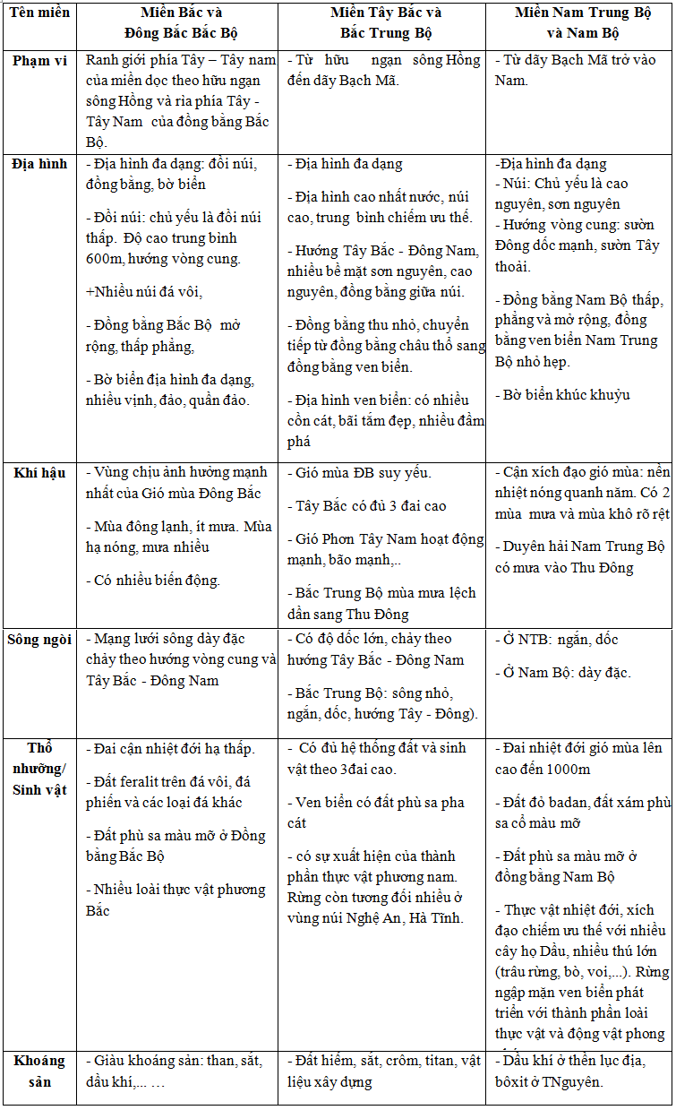 Bảng so sánh đặc điểm cơ bản của 3 miền địa lí tự nhiên