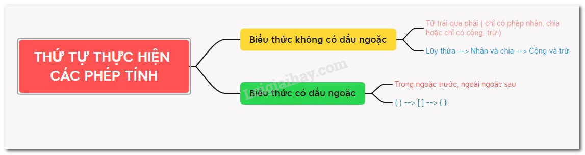 Nếu biểu thức có các dấu ngoặc : ngoặc tròn ( ), ngoặc vuông [ ], ngoặc nhọn { }, ta thực hiện phép tính theo thứ tự : \(\left( {} \right) \to \left[ {} \right] \to \left\{ {} \right\}\)