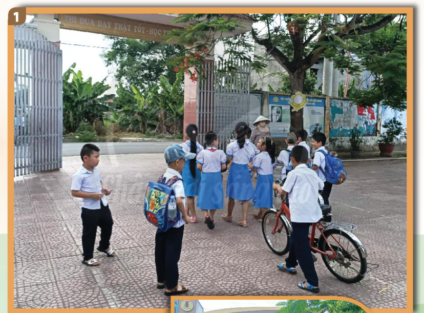 Trước và sau giờ học, ở cổng trường em diễn ra những hoạt động: xếp hàng vào trường, vui chơi, mua đồ ăn sáng…