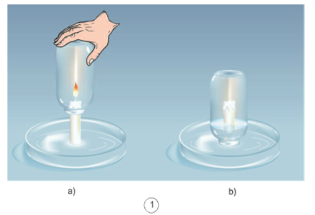 Đốt cháy một cây nến, gắn vào một đĩa thuỷ tinh rồi rót nước vào đĩa. Lấy một lọ thuỷ tinh úp lên cây nến đang cháy (như hình 1). Mô tả hiện tượng xảy ra sau khi úp lọ thủy tinh.