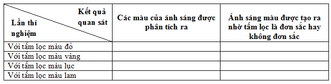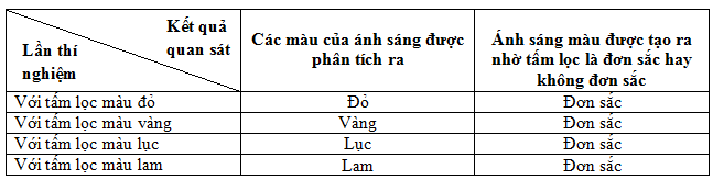 a) Màu của các ánh sáng được phân tích ra từ các ánh sáng màu tạo ra nhờ các tấm lọc màu khác nhau.