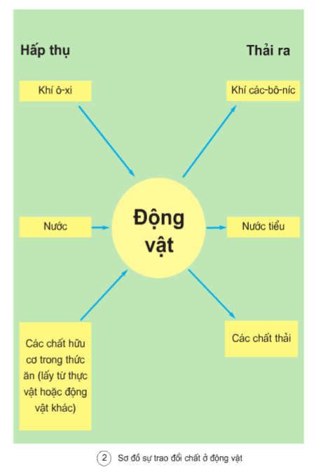 Hàng ngày, động vật lấy khí ô-xi từ không khí, nước, thức ăn cần thiết cho cơ thể sống và thải ra môi trường khí các-bô-níc, nước tiểu, phân.